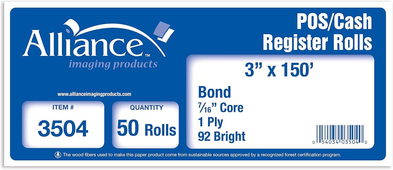 Bond Paper Receipt Rolls 3″ width x 7/16″core – 50 Rolls per Carton… (150 Foot Length)(150 Foot Length)